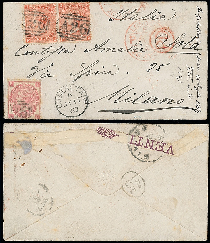 1021 c, entire, etc. imageGibraltar: Great Britain used in Gibraltar: 1867 (July 17) cover to Milan bearing 4d. vermilion plate 8 pair and 3d. rose plate 4 watermark emblems (scarce on cover) cancelled by “A26” cancellations, various transit marks. Photo. (Image1)