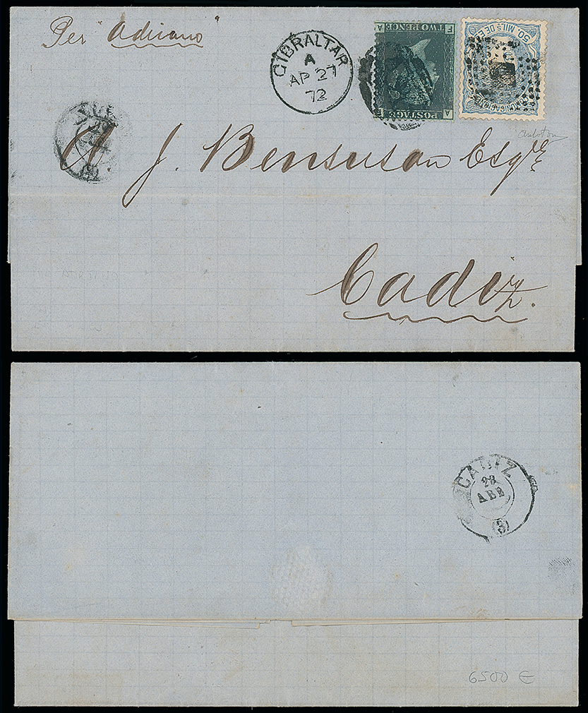 1022 c, entire, etc. imageGibraltar: Great Britain used in Gibraltar: 1872 (Apr. 27) entire letter endorsed “Per Adriano” to Cadiz, bearing 2d. blue plate 13 FA tied by “A26” cancellation with Gibraltar c.d.s. alongside and Spain 50m. blue cancelled by diamond of dots, arrival c.d.s. on reverse. An important cover, only two examples of this combination on cover are believed to exist. Ex Stirrups. With Mirman (2002), Graus (undated) and Comex (2007) certificates. Photo. (Image1)