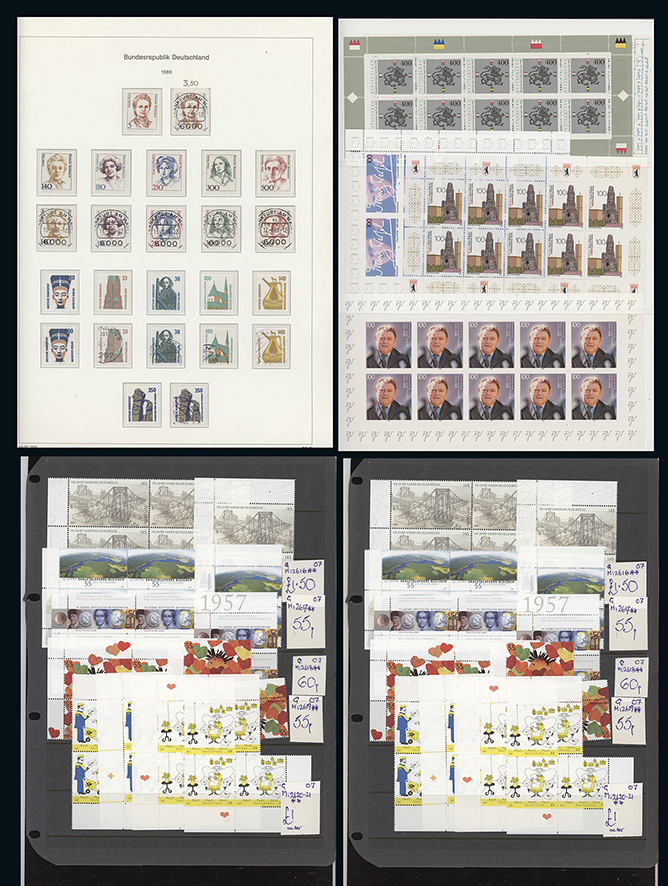1012 imageGermany: West Germany: An accumulation in ten volumes, incl. 1970 to 1999 almost complete unmounted mint and used collections in five Safe albums, similar 1980 to 1990 collections in two Ka-Be albums, 1996 to 2007 lightly duplicated unmounted mint and used stock, booklets, mini-sheets, sheetlets etc., fine. (1,000s) (Image1)