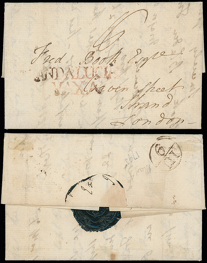 1015 c, entire, etc. imageGibraltar: 1795 (May 4) entire to London, bearing manuscript “8” rate mark, and two line “ANDALUCIA/VAXA” in red, fine. Photo. (Image1)