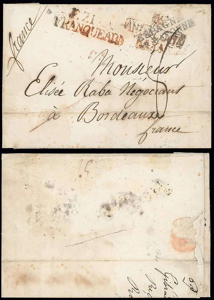 1016 c, entire, etc. imageGibraltar: 1821 (Sept. 15) entire to Bordeaux, bearing two line “EZIXA/FRANQUEDA” and “ANDALUCIA/VAXA” in red, also “ESPAGNE/PAR BAYONNE”, with disinfection slit. During the Cholera epidemic of 1819-21 the San Roque post remained closed and mail was diverted through Ecija. Photo. (Image1)