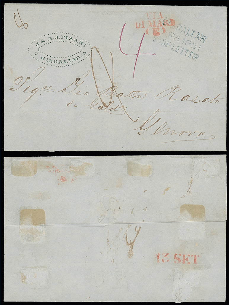 1019 c, entire, etc. imageGibraltar: 1851 (Sept. 8) entire to Genoa, bearing merchant’s mark of J. & A.J. Pisani/Gibraltar, and three line “GIBRALTAR/8 SP 8 1851/SHIP LETTER” in blue, manuscript “4” in red and black “9”, also red “VIA/DI MARE/E” also 1856 (Sept. 22) wrapper to London with bold “6” mark in blue endorsed “6d to pay” on reverse and with Gibraltar and London datestamps. (2) (Image1)