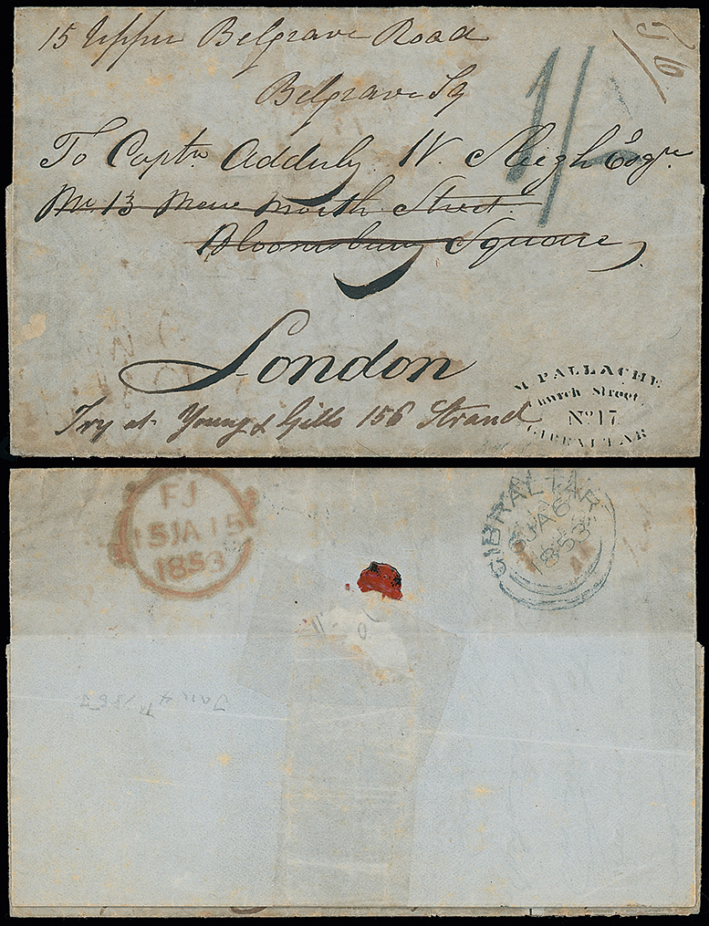 1018 c, entire, etc. imageGibraltar: 1853 (Jan. 6) entire addressed to Capt. Adduly Bloomsbury Sq. and readdressed to Belgrave, bearing “1/-” in blue, with Gibraltar datestamp and red London arrival mark on the reverse. Photo. (Image1)