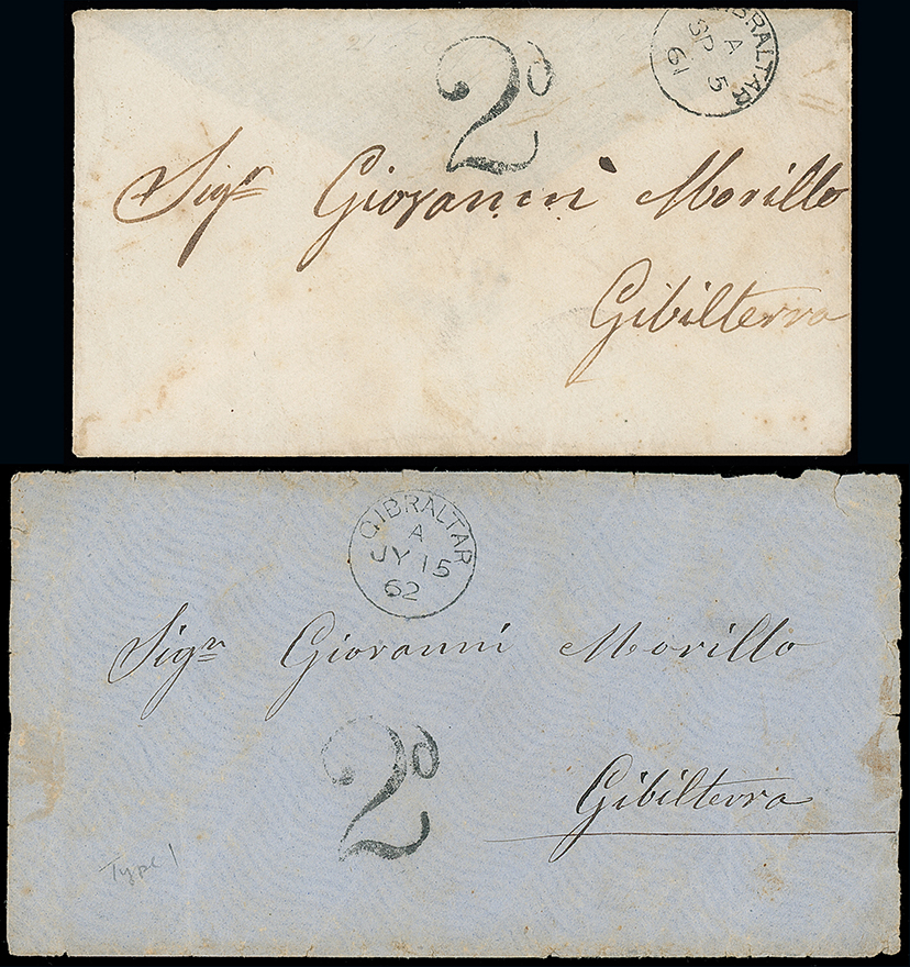 1020 c, entire, etc. imageGibraltar: 1861 (Sept. 5) and 1852 (July 15) incoming envelopes (one with rear flap missing) to the same addressee in Gibraltar, likely from Italy each with “GIBRALTAR” c.d.s. (“A” code, type D4) and handstruck “2d” (first type) in black. Gibraltar Study Circle records five examples of type 1 of this postage due mark in blue between 1857 and 1862, rare thus. Photo. (Image1)