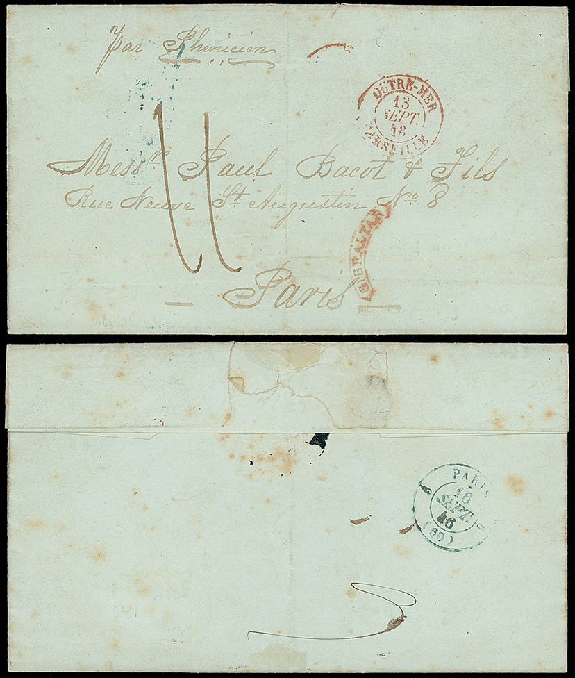 1017 c, entire, etc. imageGibraltar: 1848 (Sept. 4) entire letter (reverse with small faults) to Paris “par Phenicien” with small arc framed “GIBRALTAR” mark in red, Marseilles transit datestamp and rated “11” decimes with a Paris arrival datestamp in blue on reverse. The mark in use 1845-51 with this the fifth of eight examples in red believed to exist. Major exhibition item and significant rarity, fine and attractive. Photo. (Image1)