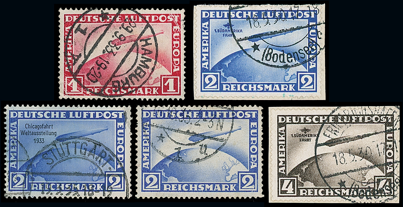 1010 Used imageGermany: A small airmail selection, comprising 1928-32 1m., 2m., 1930 South American Flight 2m. and 4m., 1933 Chicago Flight 2m., used, fair to fine. (Image1)