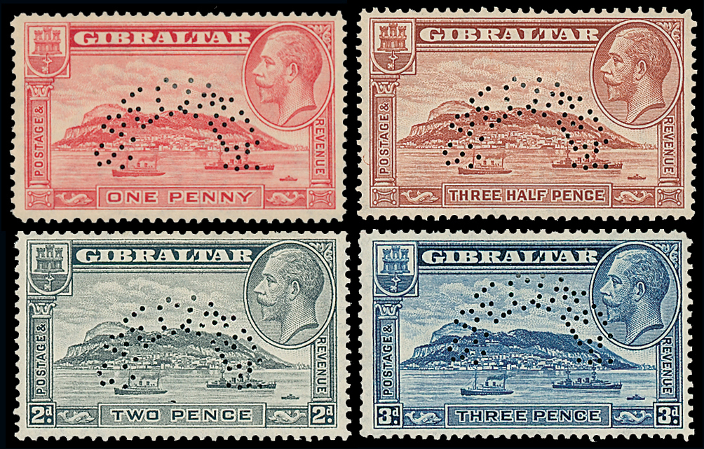 Gibraltar: 1931-33 Rock set perfin “SPECIMEN” (Samuel type D19), fine with gum. (4) Ex Metliss. Each with R.P.S. certificate (1985) S.G. 110s-113s, cat. £200. (Image1)