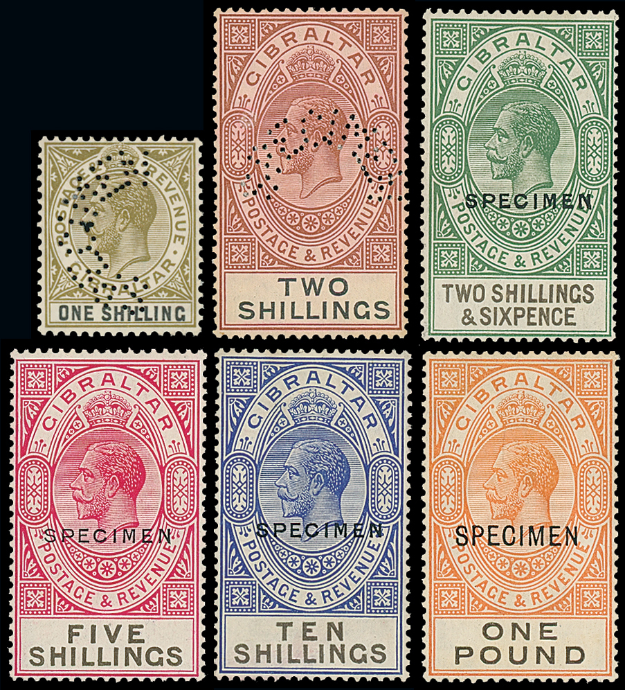 Gibraltar: 1925-32 new colours, 1s. to £1 overprinted or perfin “SPECIMEN”, mainly fine with gum. (6) S.G. 102s-107s, cat. £550. Photo. (Image1)