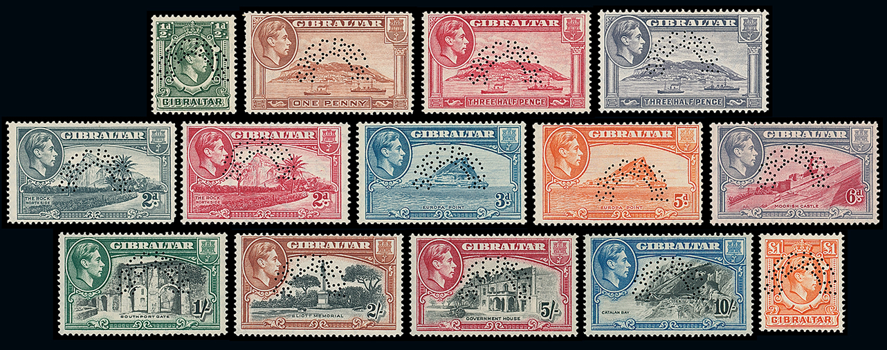 Gibraltar: 1938-51 1/2d. to £1 set perfin “SPECIMEN” (Samuel type D20), with gum, mainly fine with most unmounted. (14) S.G. 121s-131s, cat. £900. Photo. (Image1)
