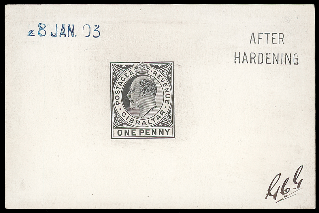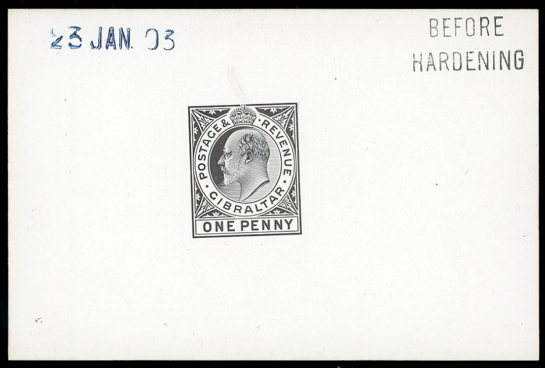 Gibraltar: 1903 1d. die proof in black on glazed card (92 x 60mm), endorsed “BEFORE HARDENING” and dated “23 JAN. 03”. Photo. (Image1)