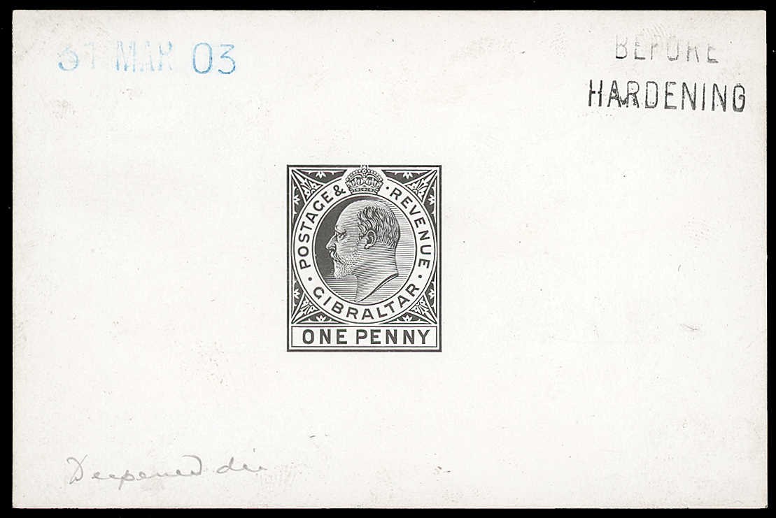 Gibraltar: 1903 1d. die proof (deepened die) in black on glazed card (92 x 60mm), endorsed “BEFORE HARDENING”, dated “31 MAR. 03” with manuscript “Deepened die”. Photo. (Image1)