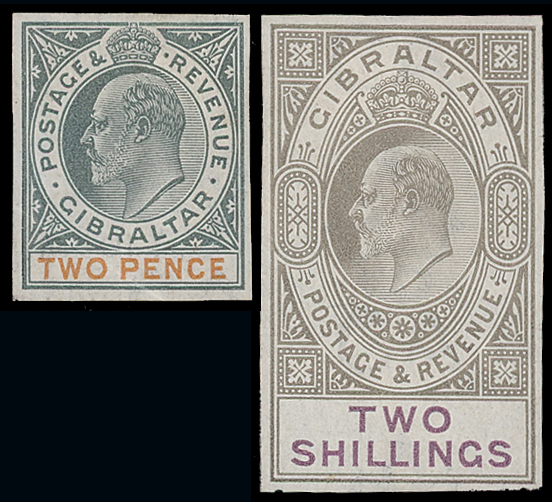 Gibraltar: 1903 imperf. colour trials (2) printed in unissued colours on gummed watermark Crown CA paper, 2d. in grey-green and orange (corner crease, traces of gum) and 2s. grey and purple. Photo. (Image1)