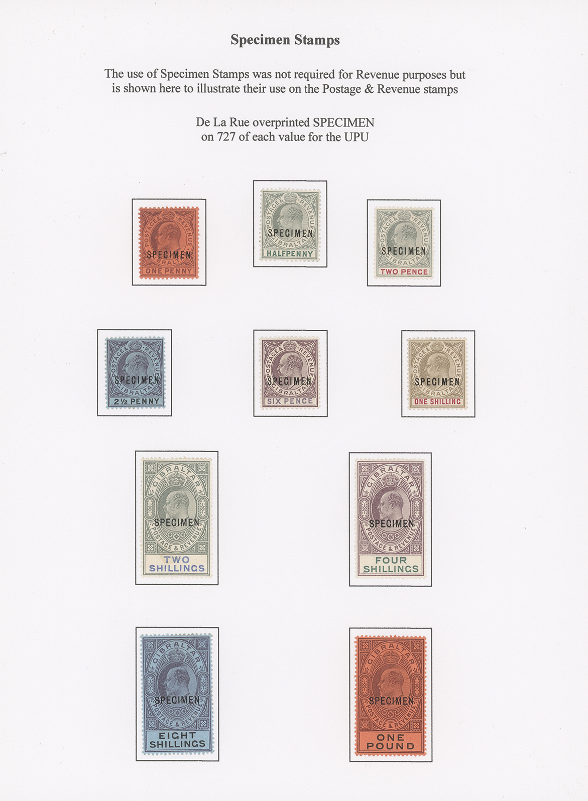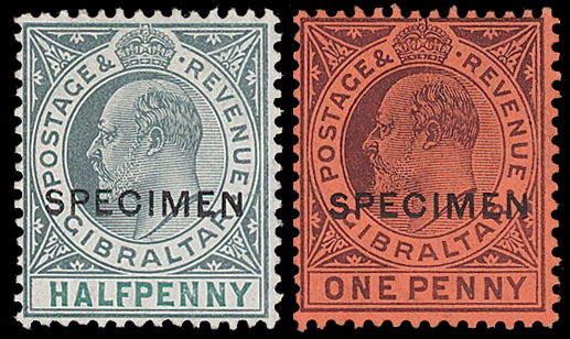 Gibraltar: 1904 De La Rue file copies of the trials of the Watermark Mult. Crown CA chalk surfaced paper 1/2d. grey-green and green and 1d. dull purple on red overprinted “SPECIMEN” (Samuel type D9), with gum,