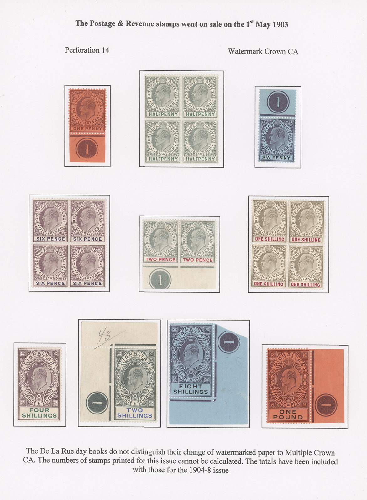 Gibraltar: 1903 1/2d. to £1 set with 1d., 2d. pair, 21/2d., 2s., 8s. and £1 marginal or corner plate number examples and 1/2d., 6d. and 1s. blocks of four, fine mint. (20) S.G. 46-55, cat. £1,490+. Photo. (Image1)