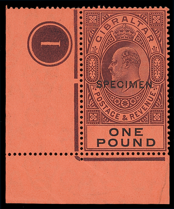 Gibraltar: 1904 De La Rue file copy of the trial of the Watermark Mult. Crown CA chalk surfaced paper £1 deep purple and black on red corner plate number example overprinted “SPECIMEN” (Samuel type D9), with gum,