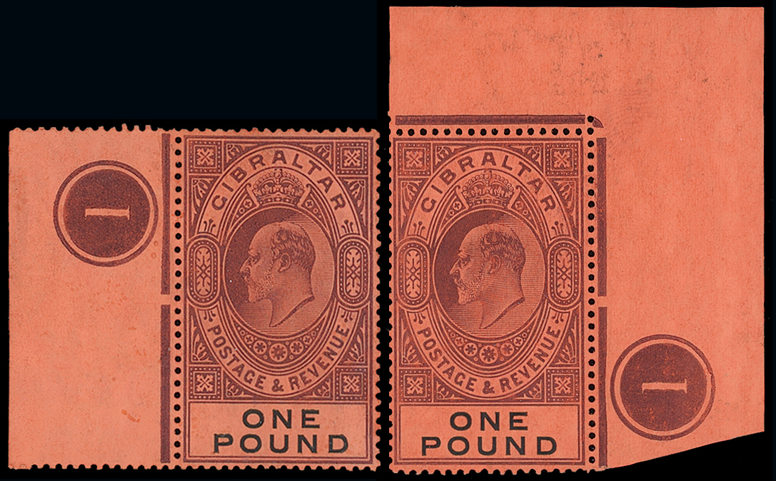 Gibraltar: 1904-08 Watermark Mult. Crown CA £1 deep purple and black on red (2), fine mint marginal and corner plate number examples, the former with disturbed gum and the latter with stamp unmounted. Supposedly