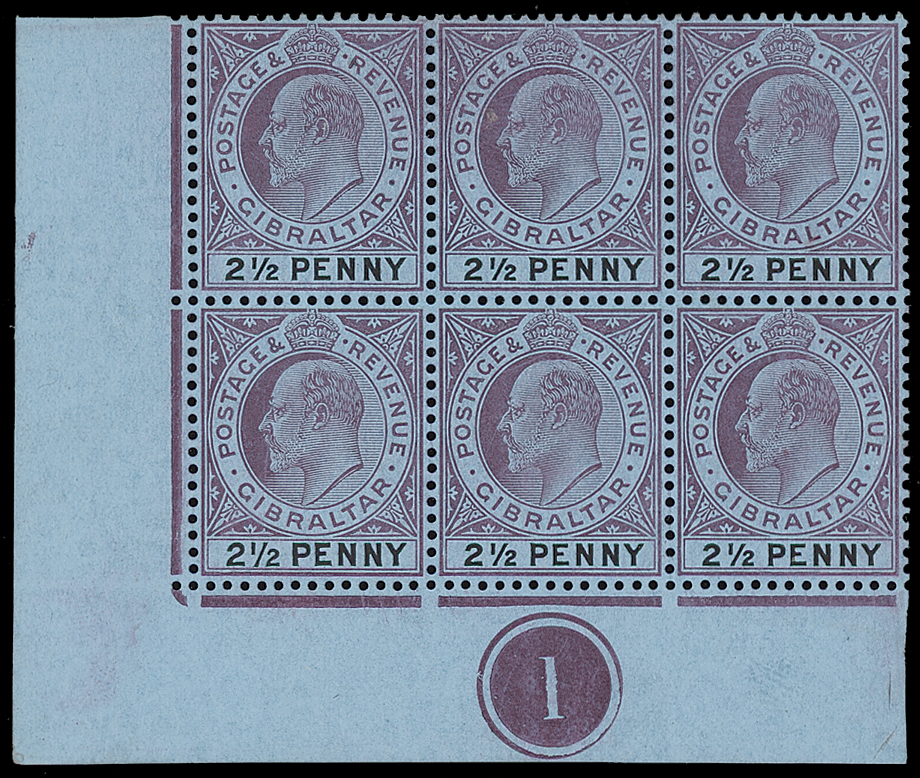 Gibraltar: 1904-08 Watermark Mult. Crown CA 21/2d. purple and black on blue lower left corner plate number block of six with large “2” in “1/2” variety (R. 10/1), fine mint. S.G. 59, 59a, cat. £875+. Photo. (Image1)