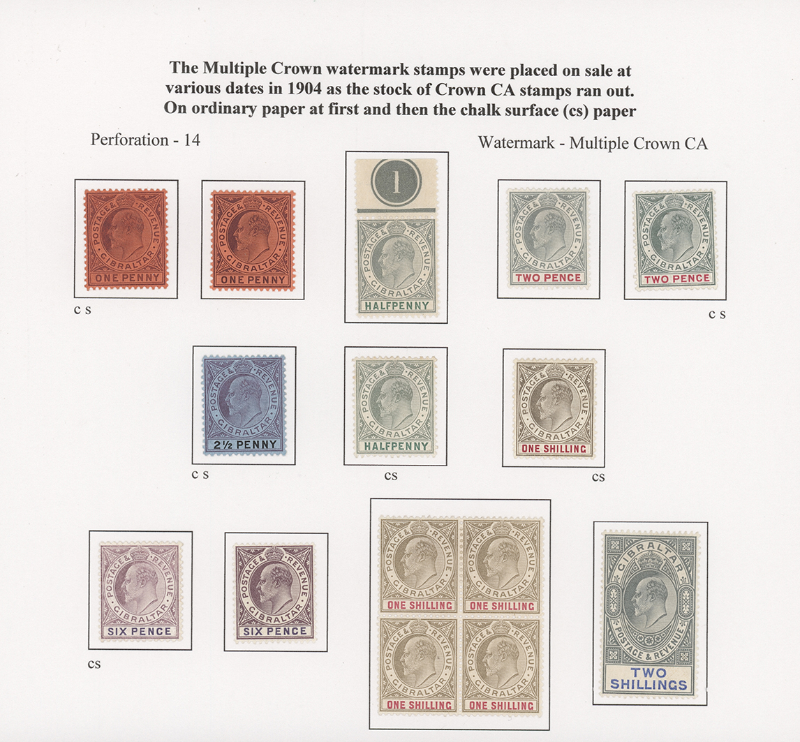 Gibraltar: 1904-08 1/2d. to 2s. set with 1/2d., 1d., 2d., 6d. and 1s. ordinary and chalky paper variants, 1s. ordinary paper block of four, fine mint. (15) S.G. 56-62, cat. 698+. (Image1)