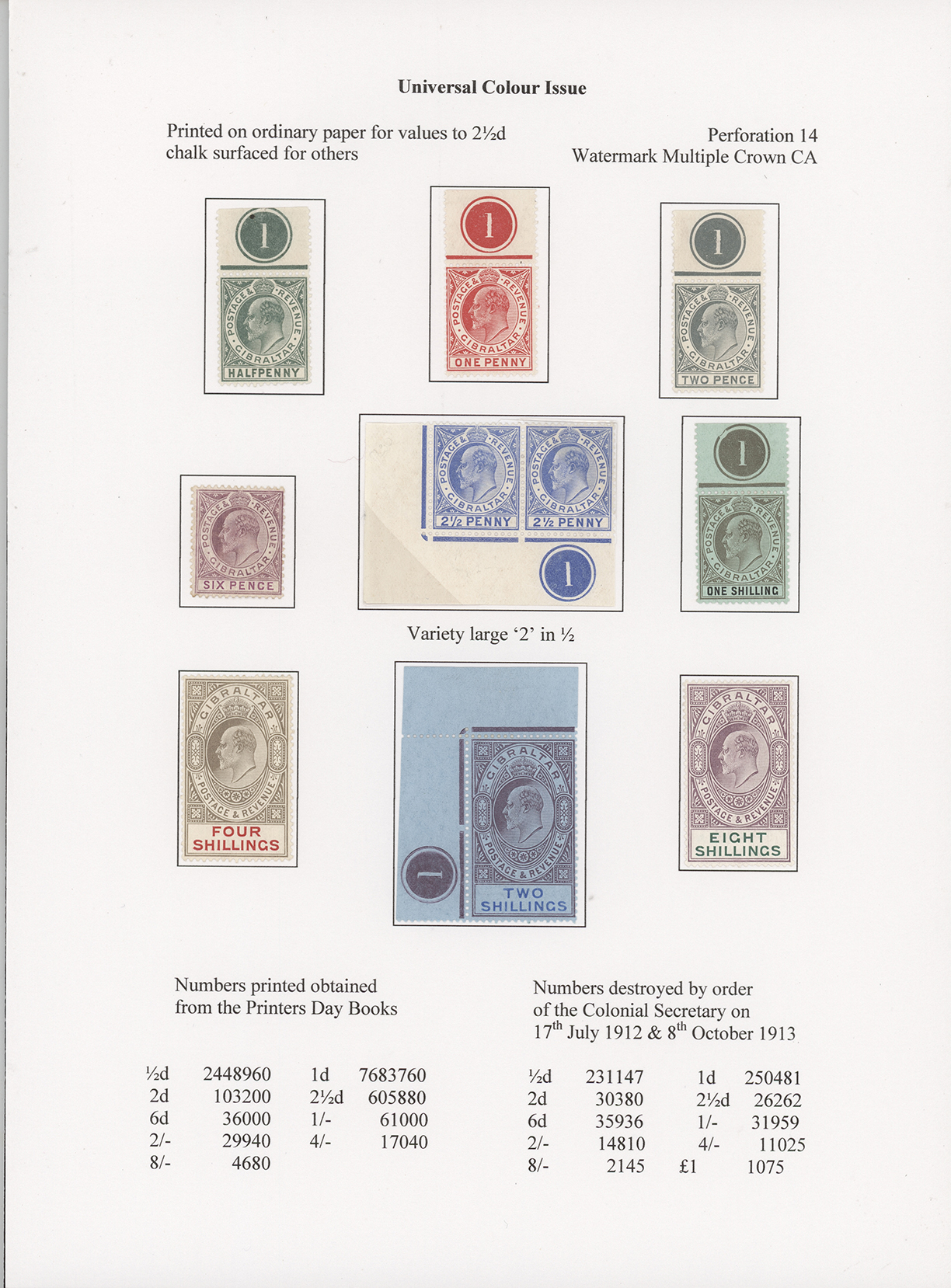 Gibraltar: 1906-11 1/2d. to 8s. set, many marginal plate number examples incl. 21/2d. lower left corner pair with large “2” in “1/2” variety (R. 10/1), fine mint. (10) S.G. 66-74, 69a, cat. £1,025. Photo. (Image1)