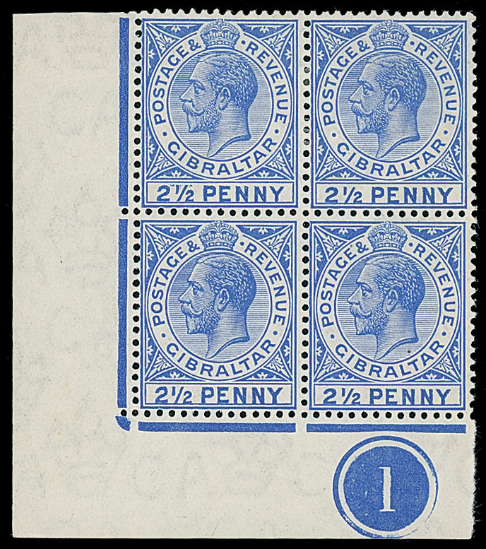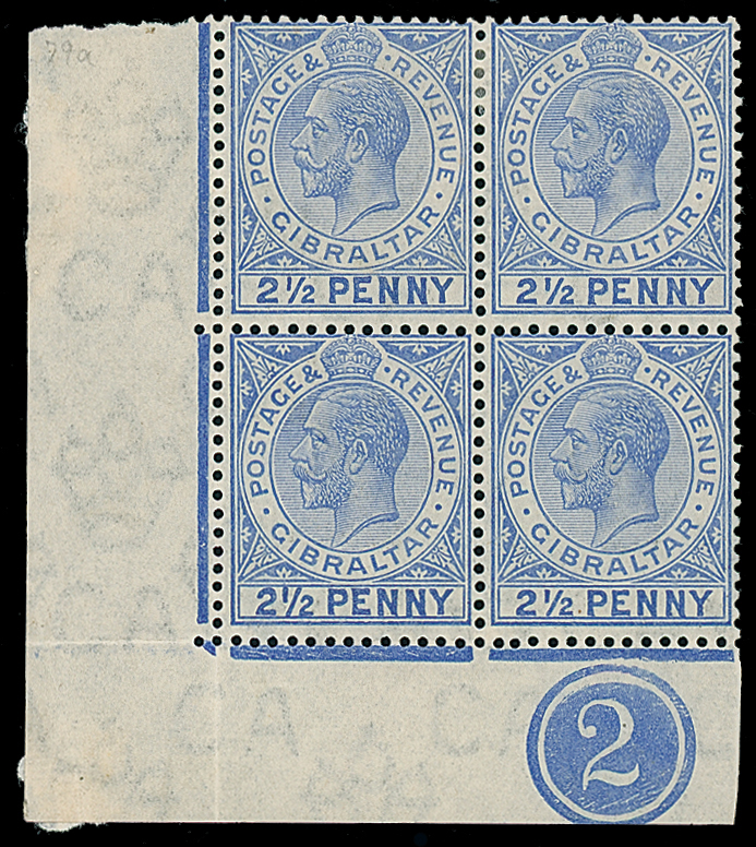 Gibraltar: 1912-24 21/2d. deep bright blue mint (unmounted in lower row) plate “2” corner block of four with one position showing the large “2” in “1/2”, very fine. S.G. 79a, cat. £300+. Photo. (Image1)