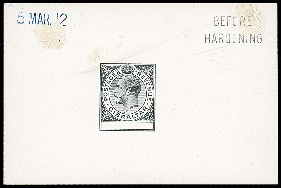 Gibraltar: 1912 Master die proof for lower denominations in black on glazed card endorsed “BEFORE/HARDENING” and dated “5 MAR. 12”. Photo. (Image1)