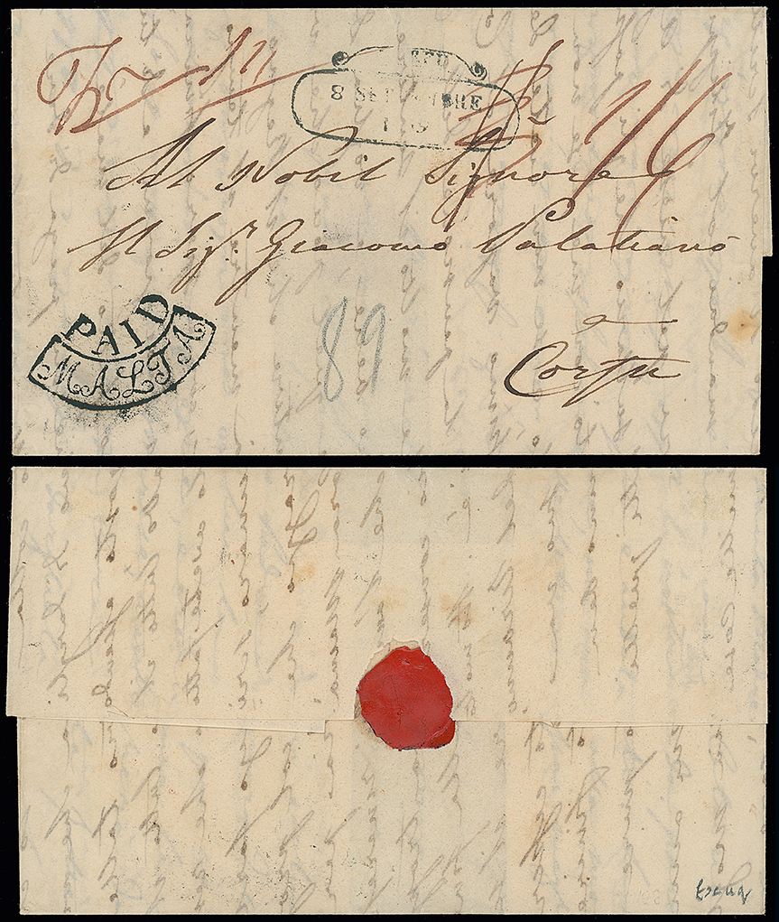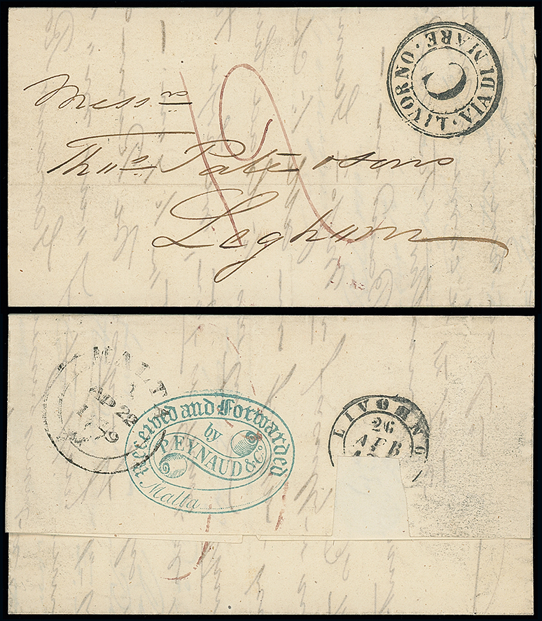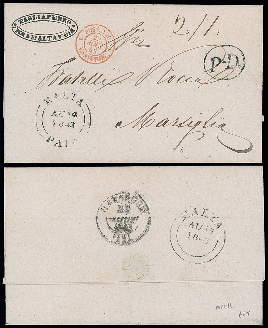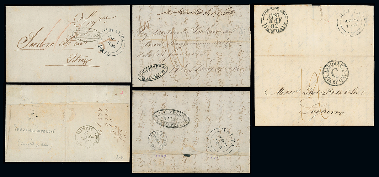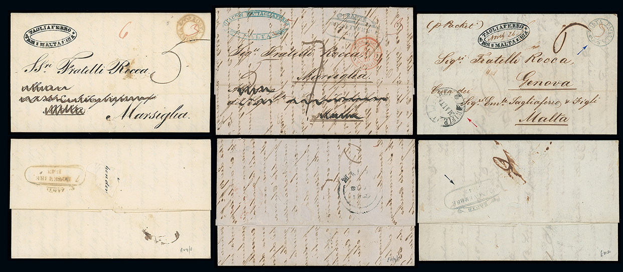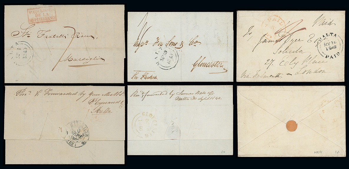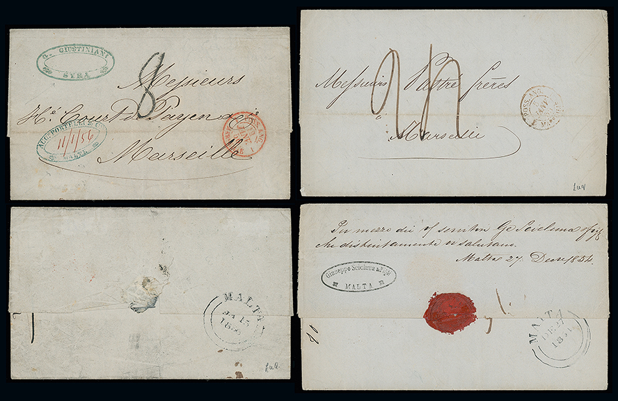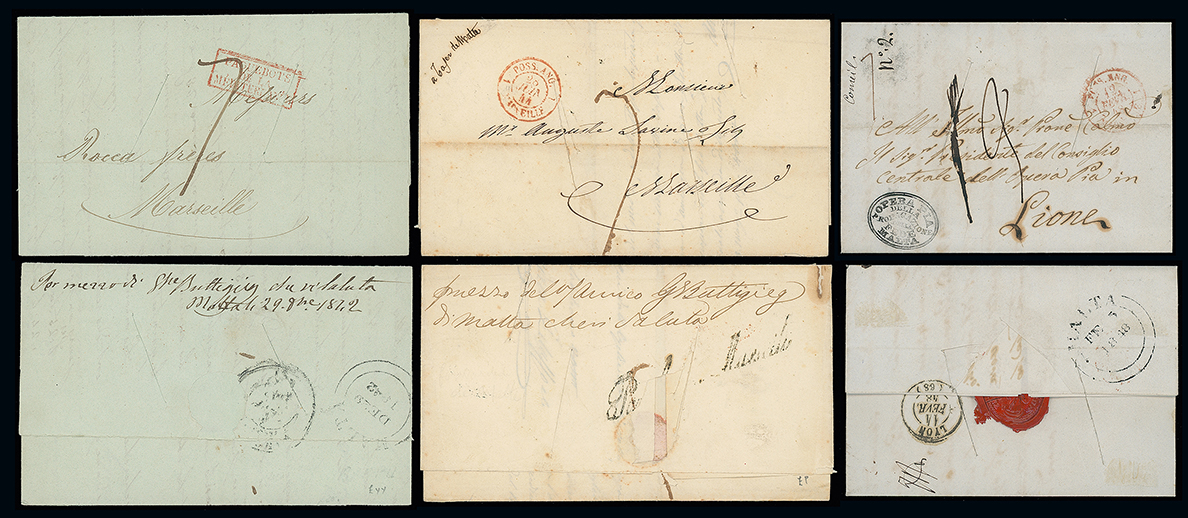 1358 c, entire, etc. imageMalta: Forwarding Agents: Six entire letters, incl. 1845 (Feb. 3) “con Vapore Francese” from Livorno to Alexandria, privately carried to Malta, with forwarding agent cachet “AUG. PORTELLI/MALTE” and “MALTA/PAID” datestamp, rated “5”(d), 1845 (Aug. 21) from Genoa to Tunis, carried privately to Livorno, from where carried by French mailboat “Dante” to Malta, with forwarding agent cachet “FRATELLI PADOVA/LIVORNO” and “MALTA POST OFFICE” mark, 1846 (June 16) and (Sep. 2) from Civita Vecchia and from Naples to Tunis carried privately, with forwarding agent cachet “GIUSEPPE PISANI/MALTA” or “LORENZO FARRUGIA/MALTA”, 1854 (Dec. 18) from Alexandria to Marseille with forwarding agent cachet “Giuseppe Scicluna & Figli/MALTA” and manuscript endorsement on reverse, Malta and Marseille datestamps and 1855 (Dec. 22) from La Canée, Crete to Marseille, with forwarding agents cachets “G.GIUSTINIANI/SYRA” and “AUGN.PORTELLI & CIE/MALTA”, Marseille c.d.s. and “8” decimes charge mark, Malta datestamp on reverse. (6) Photo. (Image1)