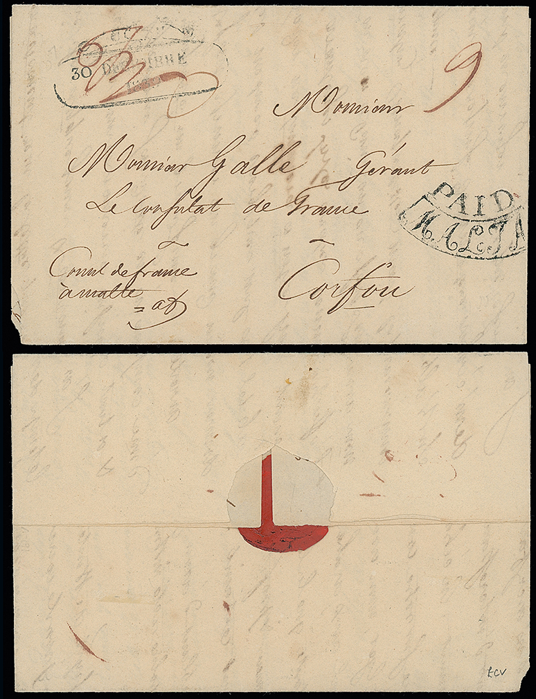 1345 Used imageMalta: PAID MALTA Cursive Scroll Marks: 1839 (Dec. 27) entire letter to Corfu with very fine black “PAID/MALTA” scroll mark (MSP-1c) with oval Corfu arrival datestamp at top left and rated “9”(d). Carried on the Admiralty Packet HMS “Acheron”. Photo. (Image1)