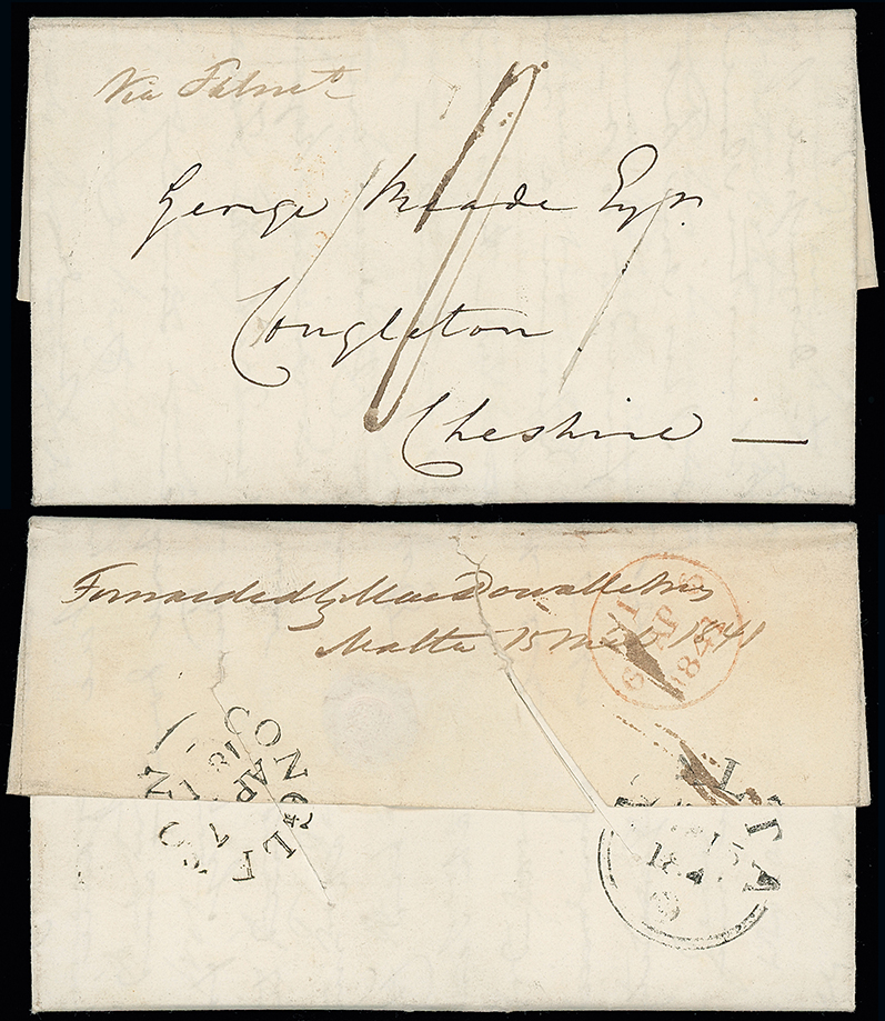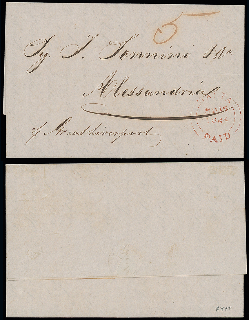 1350 c, entire, etc. imageMalta: Circular Datestamps: 1844 (Sept. 15) entire letter “p Great Liverpool” to Alexandria rated “5”(d) with “MALTA/PAID” (29mm; MPC-1a) in red. Photo. (Image1)