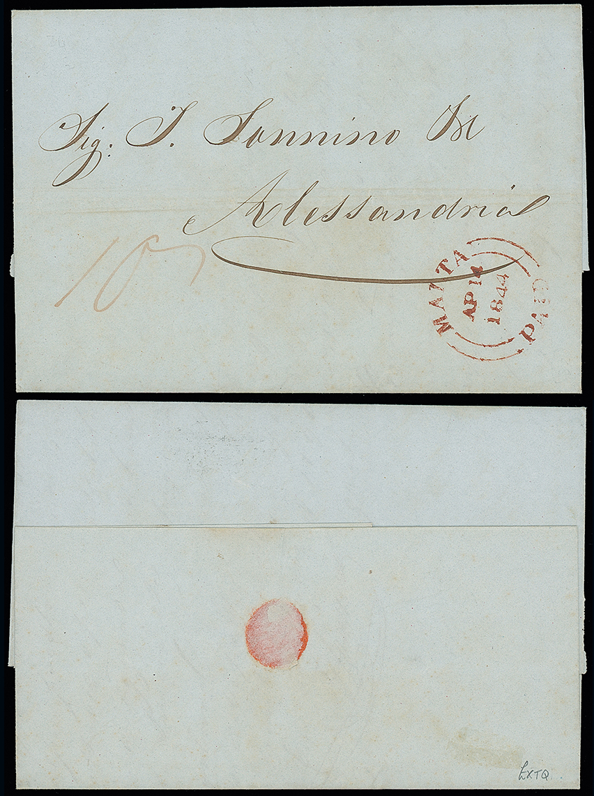 1349 c, entire, etc. imageMalta: Circular Datestamps: 1844 (Apr. 14) entire letter to Alexandria rated “10”(d) with early use of “MALTA/PAID” (29mm; MPC-1a) in red. Photo. (Image1)