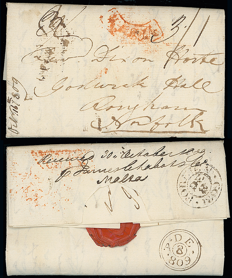 1351 c, entire, etc. imageMalta: Forwarding Agents: 1809 (Oct. 16) entire letter to England datelined in HMS “Amphion” at Fiume and carried to Malta where endorsed by agent on the reverse “Received 30th October 1809/pJames Cabot & Co./Malta” with framed “MALTA” scroll mark in red and two London transit datestamps and an intact red wax seal on reverse. Carried on the “Eliza” from Malta to Falmouth. A very early example of a forwarded item from Malta. Photo. (Image1)