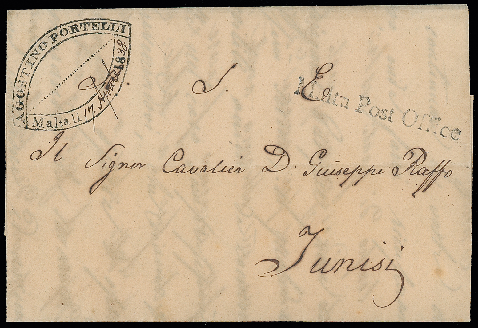 1353 c, entire, etc. imageMalta: Forwarding Agents: 1838 (Apr. 5) entire letter to Tunis datelined at Naples and carried privately to Malta with double oval “AGOSTINO PORTELLI/Malta li......” forwarding agent’s cachet and with straight line “Malta Post Office”, scarce. Photo. (Image1)