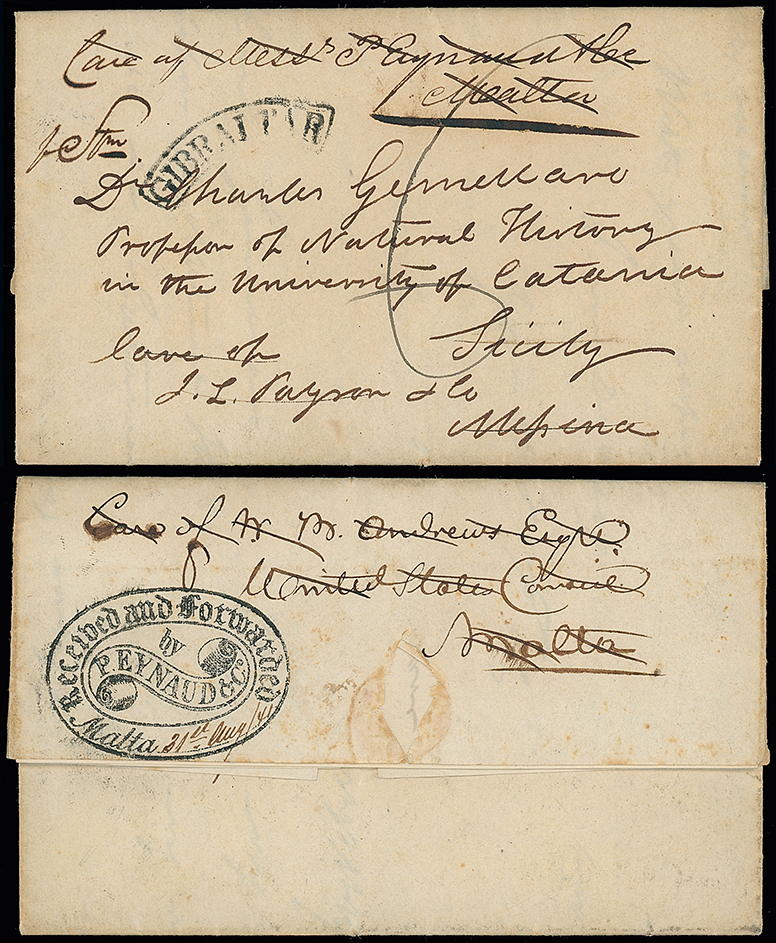 1355 c, entire, etc. imageMalta: Forwarding Agents: 1841 (May 30) entire letter to Catania, Sicily and care of an agent in Messina, from U.S.A. datelined at Harvard University, apparently posted at Gibraltar with framed “GIBRALTAR” arc mark in black and the reverse endorsed “Care of W.B.Andrews Esqre/United States Consul/Malta” deleted and with “Received and Forwarded/by/P.EYNAUD& Co/Malta” agent’s cachet below and rated “6”(d) on front. Unusual combination of agents and postal conveyance. Photo. (Image1)