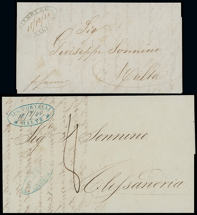 1359 c, entire, etc. imageMalta: Forwarding Agents: 1845 (July 13) entire letter to Alexandria and 1850 (Nov. 21) entire letter to Malta, both from Livorno and with oval “AUG. PORTELLI/MALTE” or “BISMOT & Co/MALTA” forwarding agents’ cachets in blue or black, the former with disinfection slits and Malta and Alexandria datestamps. (2) Photo. (Image1)