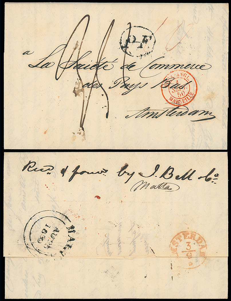 1361 c, entire, etc. imageMalta: Forwarding Agents: 1850 (Aug. 22) entire letter to Amsterdam datelined at Smyrna carried privately to Malta and endorsed “Recd & Fwd by J.Bell & Co/Malta” on the reverse. Rated “10”(d) and with Malta, Marseille and Amsterdam c.d.s’s. Photo. (Image1)