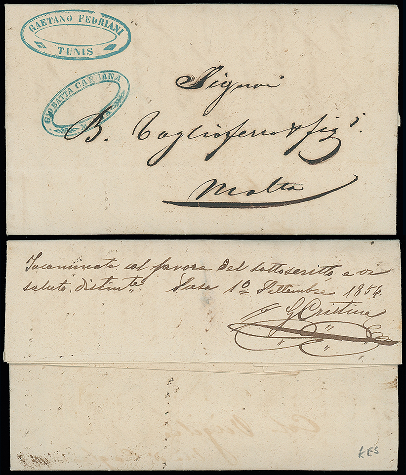 1362 c, entire, etc. imageMalta: Forwarding Agents: 1854 (Aug. 25) entire letter to Malta from Tunis and manuscript forwarded at Sousse by G. Cristina to another forwarder in Malta with oval “GIO. BATTA CARUANA/MALTA” forwarding agent’s cachet and apparently delivered privately without postal charges or marks. Photo. (Image1)