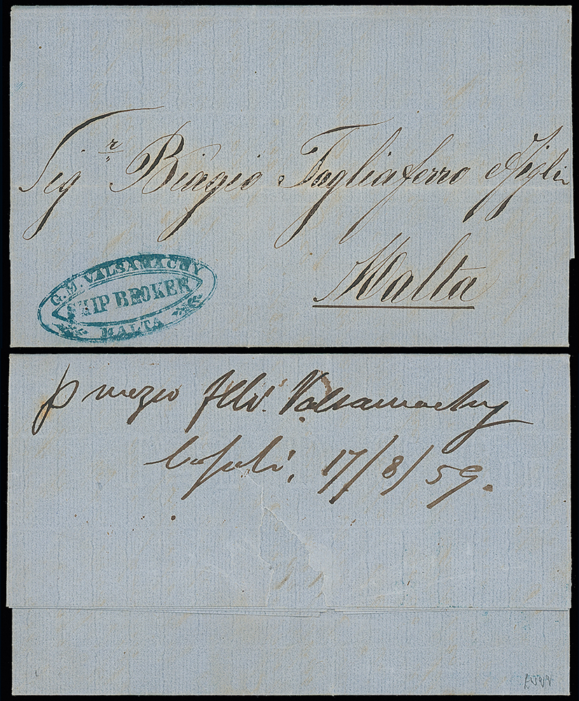 1363 c, entire, etc. imageMalta: Forwarding Agents: 1859 (Aug. 13) wrapper to Malta datelined at Odessa with manuscript forwarding endorsement of G.S. Valsamachy at Constantinople on the reverse and with matching cachet for the same forwarder “SHIP BROKER” applied on arrival in Malta for delivery to a firm in Malta. Without charge and postal markings and a very unusual example of the same forwarding firm in two countries. Photo. (Image1)