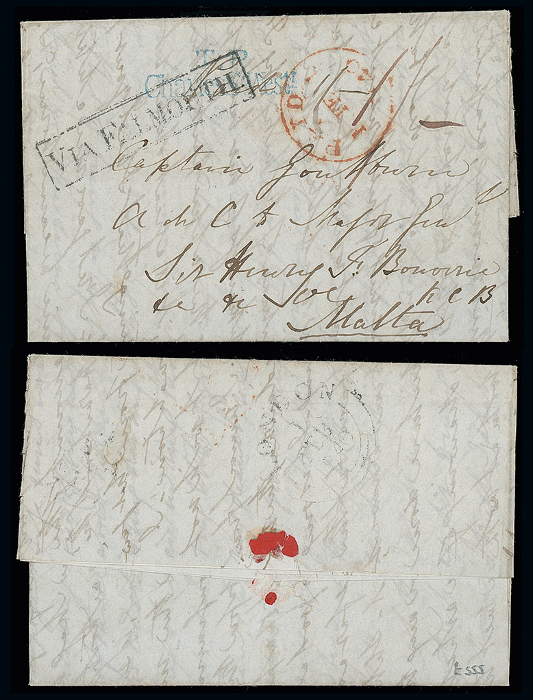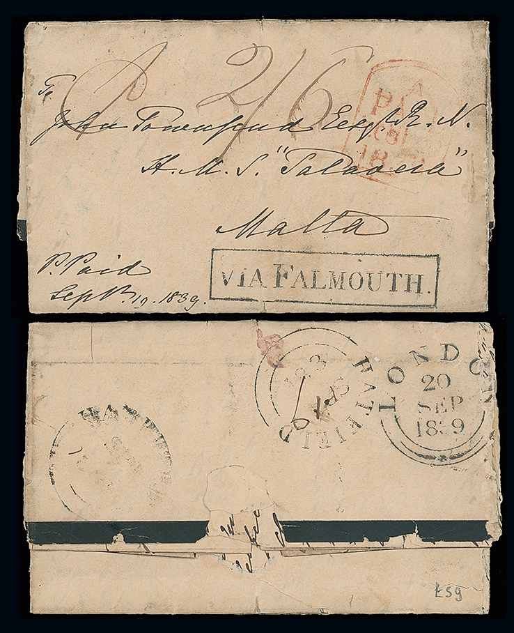 1365 c, entire, etc. imageMalta: Maritime Mail: 1839 (Sept. 18) entire mourning letter “P Paid” to H.M.S “Talavera” at Malta with London Paid tombstone datestamp, very scarce framed “VIA FALMOUTH” mark (in use 1838-40), rated “2/6”(d) carried on the “Iberia” to Gibraltar and the “Phoenix” to Malta. Ex Harper. Photo. (Image1)