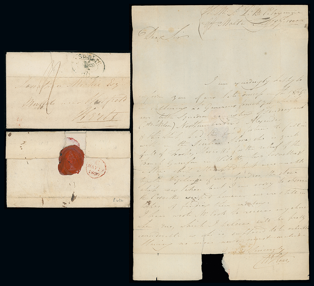 1382 c, entire, etc. imageMalta: Great Britain Ship Letter Marks: 1800 (Feb. 27) entire letter (closed tear) to England rated “11”(d) on arrival and with double oval “Ship Lre/(crown)/PORTSMOUTH” mark and London transit datestamp on reverse. Written by John Kerr on board “H.M.S Bonne Citoyenne off Malta”, “...our late success on 18 Feby in capturing Le Genereuex 74 (French gun ship from Toulon en route to the French Garrison at Malta) which our little squadron consisting of Foudroyant (Admiral Nelson), Northumberland, Alexander & this ship had the good fortune to fall in with on the Sicilian Shore....I have wrote Mr Cook to receive my share (prize money) when due, which I believe will be pretty considerable as she is supposed to be valuable”. Exceptional insight into the Maltese connection with the Napoleonic Wars. Photo. (Image1)