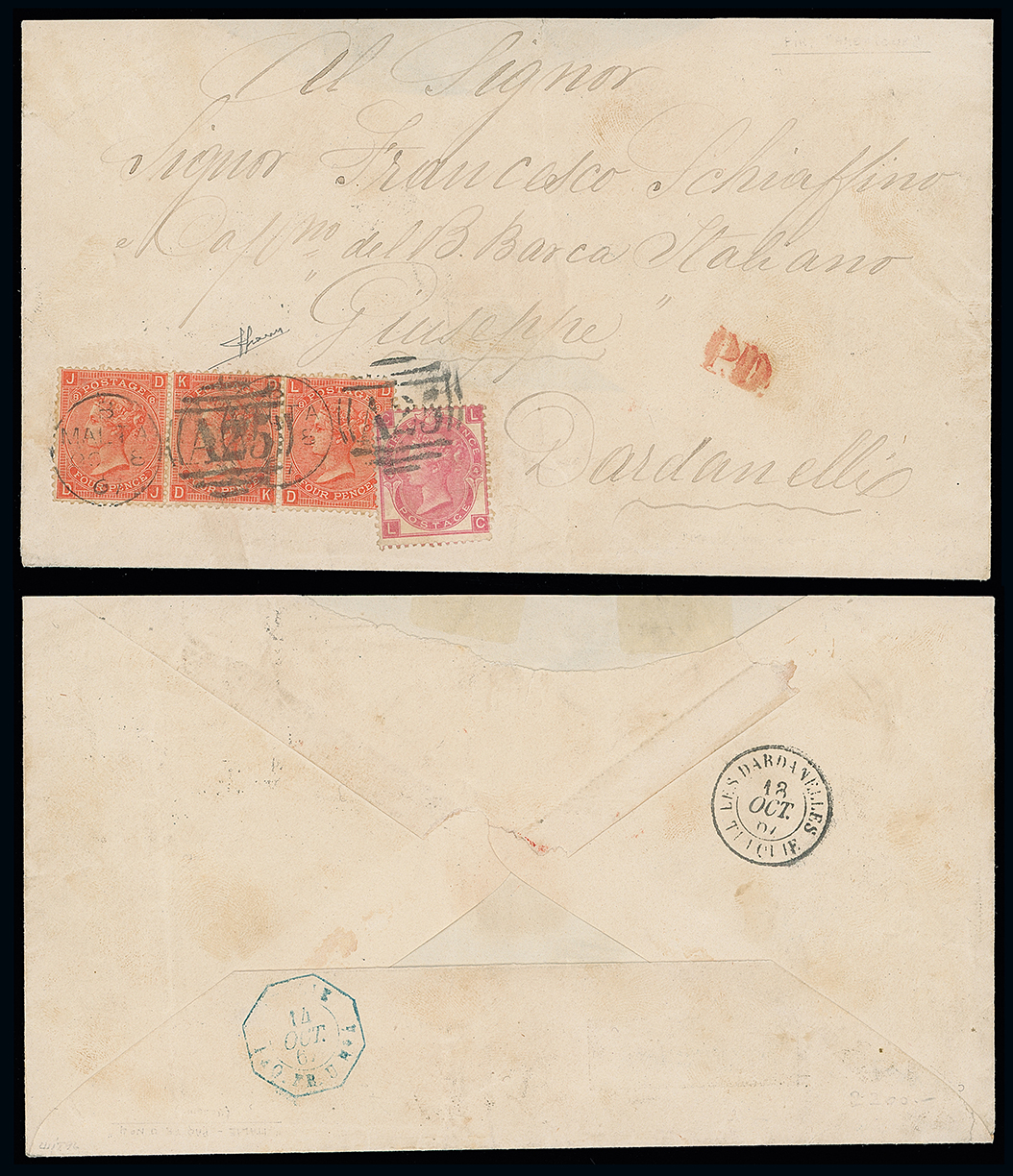 1376 c, entire, etc. imageMalta: French Mailboats: 1867 (Oct. 8) large envelope (slightly reduced) to Dardanelles, unusual thus, franked 1867 3d. plate 4 and 1865 4d. plate 8 strip of three tied by “A25” duplexes, representing the triple 5d. rate and scarce thus with red “P.D.” mark. Carried on the “Amérique” (from Messina) and the reverse with octagonal “ITALIE PAQ.FR.U No.4” (Ligne U (Marseille-Constantinople) datestamp in blue (Salles 885, unrecorded in this colour). Important mailboat cover, very attractive. B.P. (Basel) certificate. (1998). Photo. (Image1)