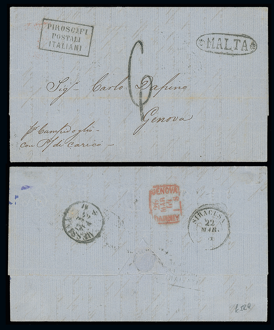 1377 c, entire, etc. imageMalta: Italian Mailboats: 1864 (Mar. 21) unpaid entire letter “pr Campidoglio” to Genoa with oval ornamental “MALTA” (probably applied on the Neopolitan line) and framed “PIROSCAFI/POSTALI/ITALIANI” marks. Charged “6” decimes and the reverse with Syracuse, Messina and Genoa datestamps fine, very rare. Ex Camilleri. Photo. (Image1)