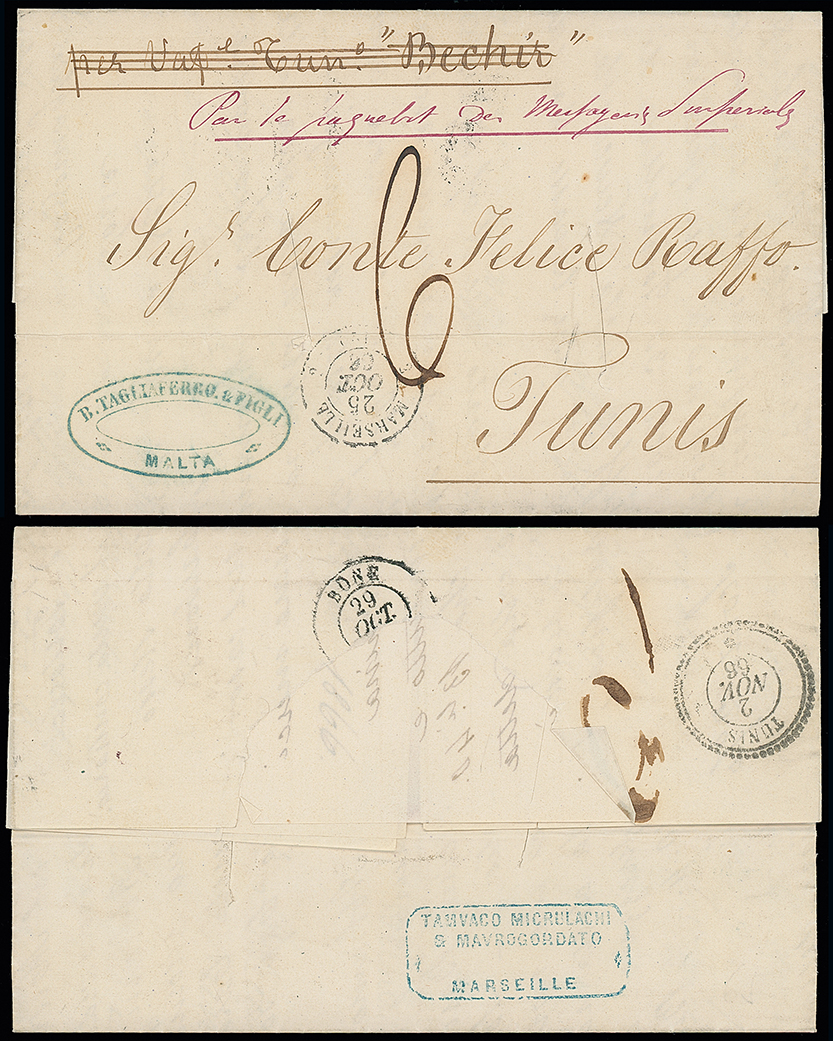 1364 c, entire, etc. imageMalta: Forwarding Agents: 1866 (Oct. 13) disinfected slit entire letter to Tunis with oval cachet of “B.TAGLIAFERRO & FIGLI/MALTA” endorsed “per Vape Tuna. Bechir” deleted and re-endorsed “Par le paquebot Messageries Imperiales” and sent to Marseille where framed “TAMVACO MICRULACHI & MAVROGORDATO/MARSEILLE” forwarding agents’ cachet applied to reverse, also with Bone, Algeria transit and Tunis arrival c.d.s. and rated “6” (décimes). Photo. (Image1)