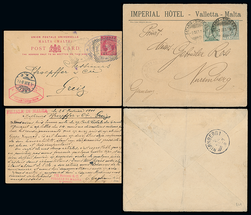 1372 c, entire, etc. imageMalta: Maritime Mail: Adria Line: 1898 (Feb. 25) cover to Germany franked 1/2d., and 2d. cancelled in transit by Catania-Siracusa T.P.O. c.d.s’s and 1901 (Feb. 25) 1d. postcard to Germany cancelled in transit by Amb. Siracusa squared circle datestamps, both with double oval “ROYAL HUNGARIAN/S.S.CAROL/SEA NAVIGATION CO. ADRIA” marks applied on board and arrival c.d.s’s. The former ex Eastgate. (2) Photo. (Image1)