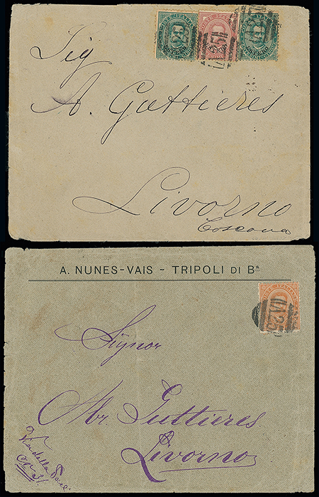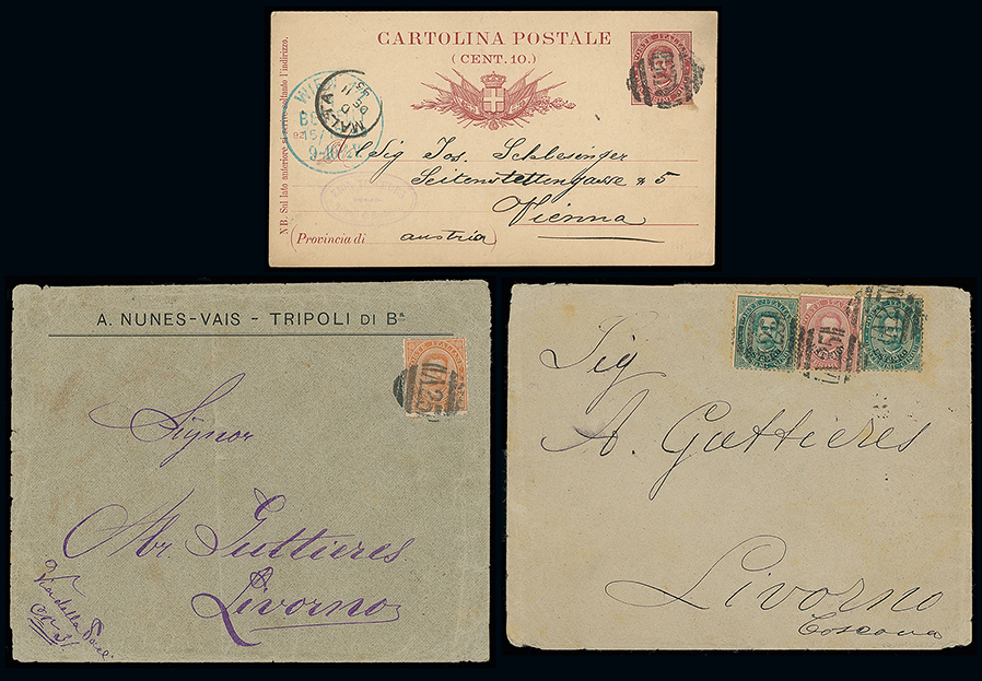 1371 c, entire, etc. imageMalta: Maritime Mail: 1889 (July) cover to Livorno franked Italian Levant 1881-83 5c. (2) and 10c. tied by upright oval “A25” bar cancellations in transit and posted on board a ship from Tripoli and the reverse with Malta, Naples and Livorno datestamps, 1891 (May) similar cover franked Italy 1879-82 20c. tied in transit by upright oval “A25” cancellation and 1893 (Dec. 11) Italy 10c. postcard to Vienna also from Tripoli and with Malta c.d.s. and upright oval bar “A25” cancellation. The last ex Coates. (3) (Image1)