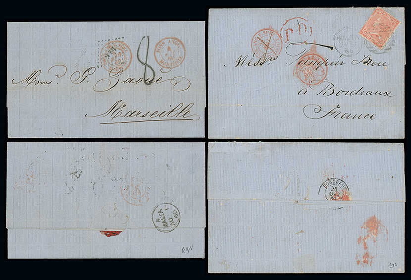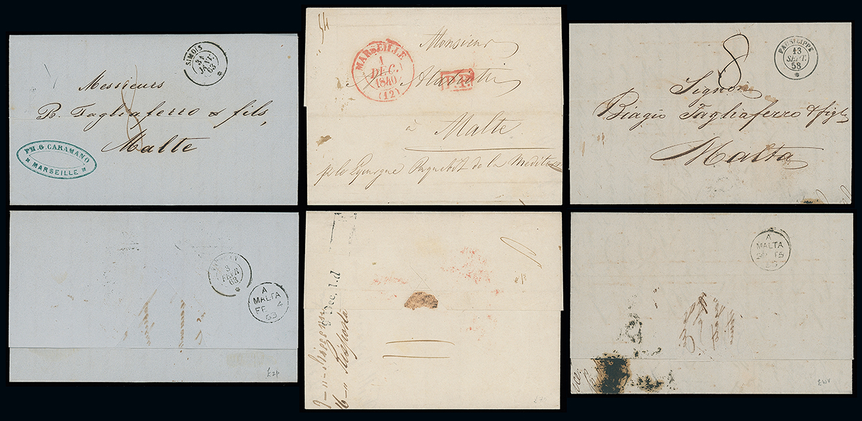 1374 c, entire, etc. imageMalta: French Mailboats: 1858 (Sept. 14) entire letter to Malta from Messina with “PAUSILIPPE” (Ligne d’Italie) mailboat c.d.s. and rated “8”(d) due on arrival, Malta c.d.s. on reverse, 1863 (Jan. 31) entire letter to Malta from Marseille with “SIMOIS” (Ligne du Levant) mailboat c.d.s. (from Marseille to Messina) and “VATICAN” (Ligne D’Italie) c.d.s. (from Messina to Malta), rated “8”(d) due on arrival, Malta c.d.s. on reverse, an unusual example with two mailboat datestamps, also 1840 (Dec. 1) wrapper to Malta with Marseille c.d.s and framed “P.P.” mark endorsed to be carried by the “Lycurgue” (Ligne du Levant). (3) Photo. (Image1)