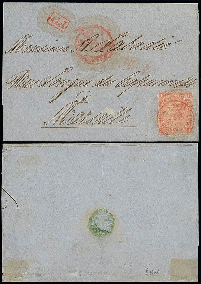 1370 c, entire, etc. imageMalta: Maritime Mail: 1865 (Oct. 23) entire letter to Marseille franked 1865 4d. plate 7 cancelled on arrival and tied by “POSS.ANG.I./MARSEILLE” c.d.s. twice in red with additional strike at top and a framed “PD” mark also in red, highly unusual. Ex Bollen Photo. (Image1)
