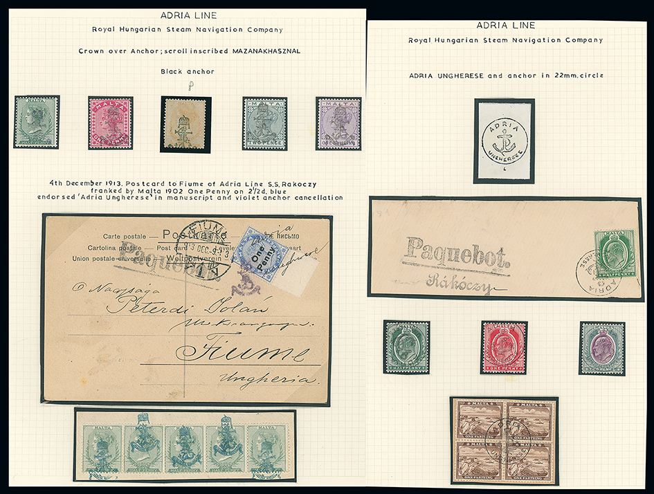 1373 imageMalta: Maritime Mail: Adria Line: Crown over anchor scroll “MAZANAKHASZNAL” cancellations group incl. on 1/2d. (7, incl. one ex Orme and a horizontal strip of five tied to a piece), 1d. on 21/2d. (tied to 1913 picture postcard to Fiume with underlined “Paquebot.” mark), 2d. and 1s., also a selection with the circular “ADRIA/(anchor)/UNGHERES” cancellation (8, incl. a single on a large piece with an underlined “Paquebot.” cancellation and a block of four on a piece). (19) (Image1)