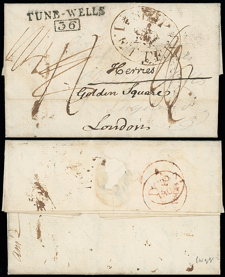 1383 c, entire, etc. imageMalta: Great Britain Ship Letter Marks: 1803 (July 24) entire letter to Tunbridge Wells, redirected to London with “TUNB- WELLS/36” mileage mark and oval “SHIP/(crown)/LETTER” (Robertson S10) carried by HMS Frigate Blonde unusually landed at Chatham, rated a total of “1/4”(d) to include 1d. ship letter 5d. to London and 10d. to Tunbridge Wells. The letter, datelined at Malta, from Captain J. Herries to his father “I received his letter via Naples which cost me a day’s pay.....in future I wish him to send them by sea”. Photo. (Image1)