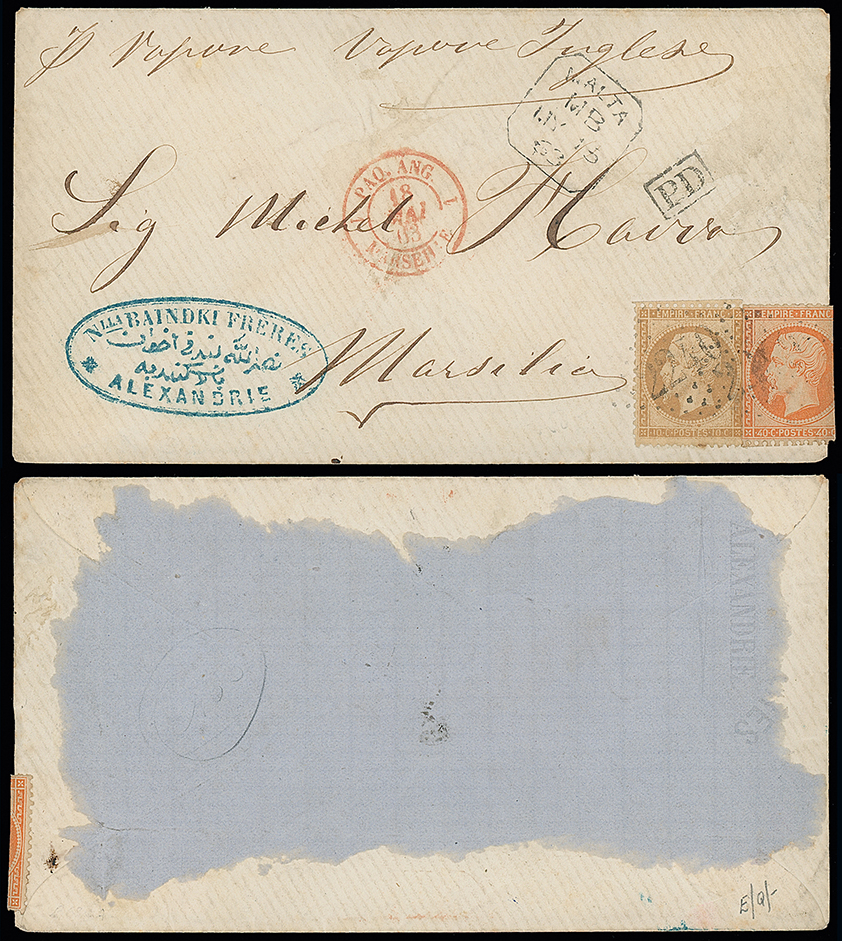 1369 c, entire, etc. imageMalta: Maritime Mail: 1863 (May) envelope “p Vapore Inglese” to Marseille from Alexandria (merchants cachet at lower left) franked France 1862 10c. and 40c. (folded over edge) tied by dotted “2240” (Marseille) rhomboid cancellations, carried by a British ship with framed “MALTA/MB” movable box datestamp, framed “PD” mark in black and Marseille c.d.s. in red, very scarce. Photo. (Image1)