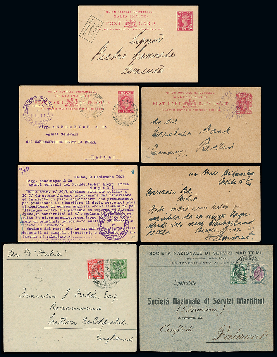 1378 c, entire, etc. imageMalta: Italian Mailboats: 1888 (Nov. 29) 1d. postcard to Italy with framed “PIROSCAFI/POSTALI.ITALIANI” mark, 1907 (Sept. 2) 1d. postcard to Naples with Italian packet “SUMATRA/PIROSCAFI POST./ITALIANI” double ring c.d.s’s, 1911 printed envelope for the “SOCIETA NAZIONALE DI SERVIZI MARITTI” to Palermo franked 1/2d. and 1d, 1920 (July 15) 1d. postcard to Berlin with “TEBE/PIROSCAFI POST./ITALIANI” double ring c.d.s. and 1930 envelope to England franked 1/2d. and G.B. 1d. tied by “SOCIETA DI DERVIZI MARITTIMI/PIROSCAFI ITALIA” mark. (5) Photo. (Image1)
