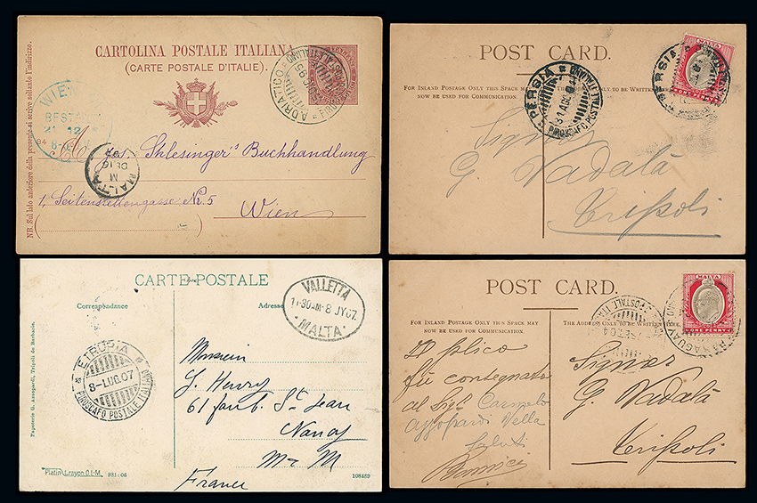 1379 c, entire, etc. imageMalta: Italian Mailboats: Selection of postcards from 1895 to 1907 to Vienna (Italian 20c. postcard), France or Tripoli former two with Malta transit datestamps and each with “PIROSCAFI POSTALE ITALIANO” double ring c.d.s. for the ships “ADRIATICO”, “ETRURIA”, “PERSIA” and “PARAGUAY”, mostly fine. (4) Photo. (Image1)